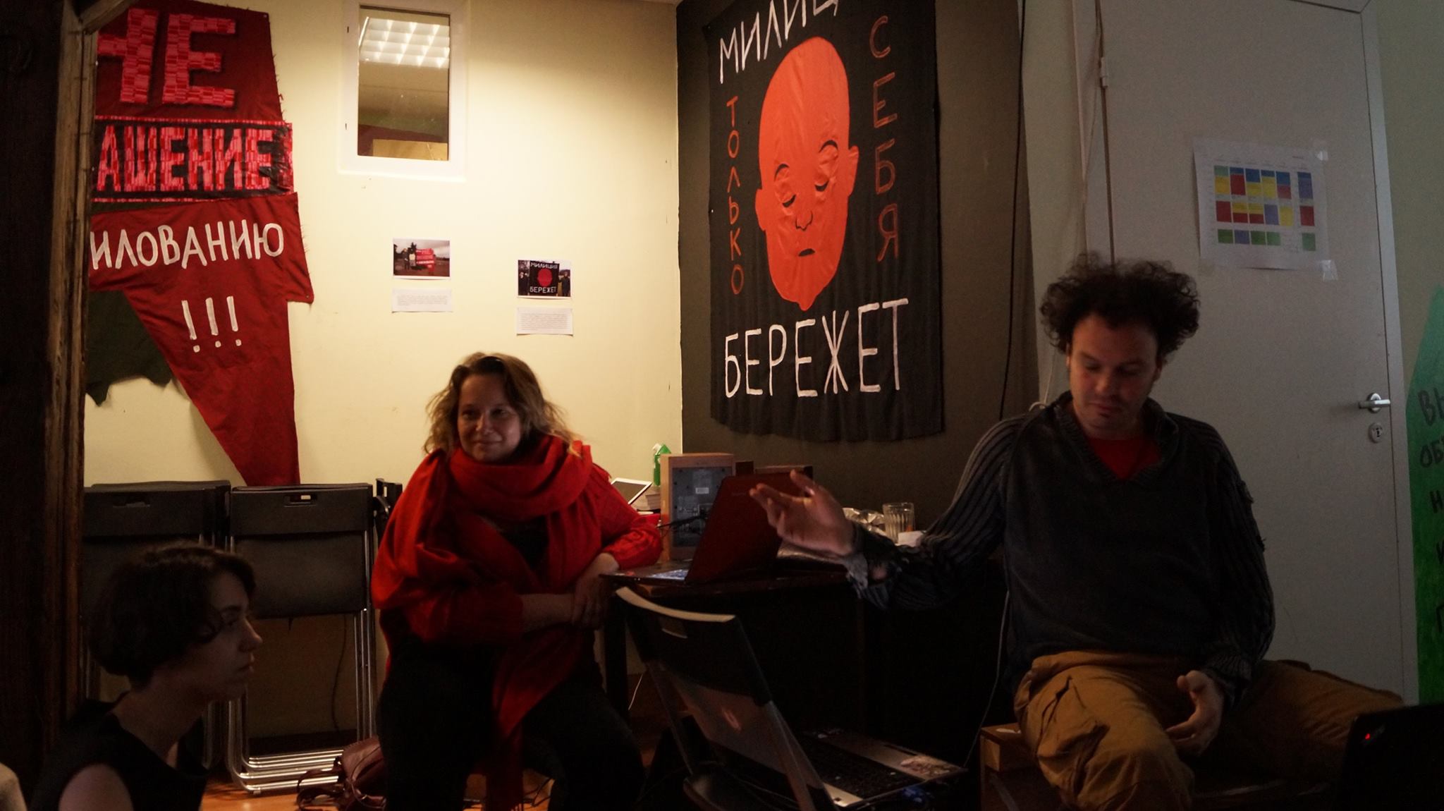 Introducing Perpetuum Mobile and its major thematic projects, Ivor Stodolsky and Marita Muukkonen showed excerpts from PM’s latest film and discussed the historical and theoretical origins of their curatorial practice. The presentation in St.Petersburg featured art by Re-Aligned artists such as Nikolay Oleynikov, Nuria Guell, Petr Pavlensky and Ramy Essam “the voice of Tahrir Square”. The discussion lead to an investigation of the potentials of “pre-mondial re-alignments” and solidarity networks such as PM’s ongoing Safe Haven for art practitioners at risk residency program.
