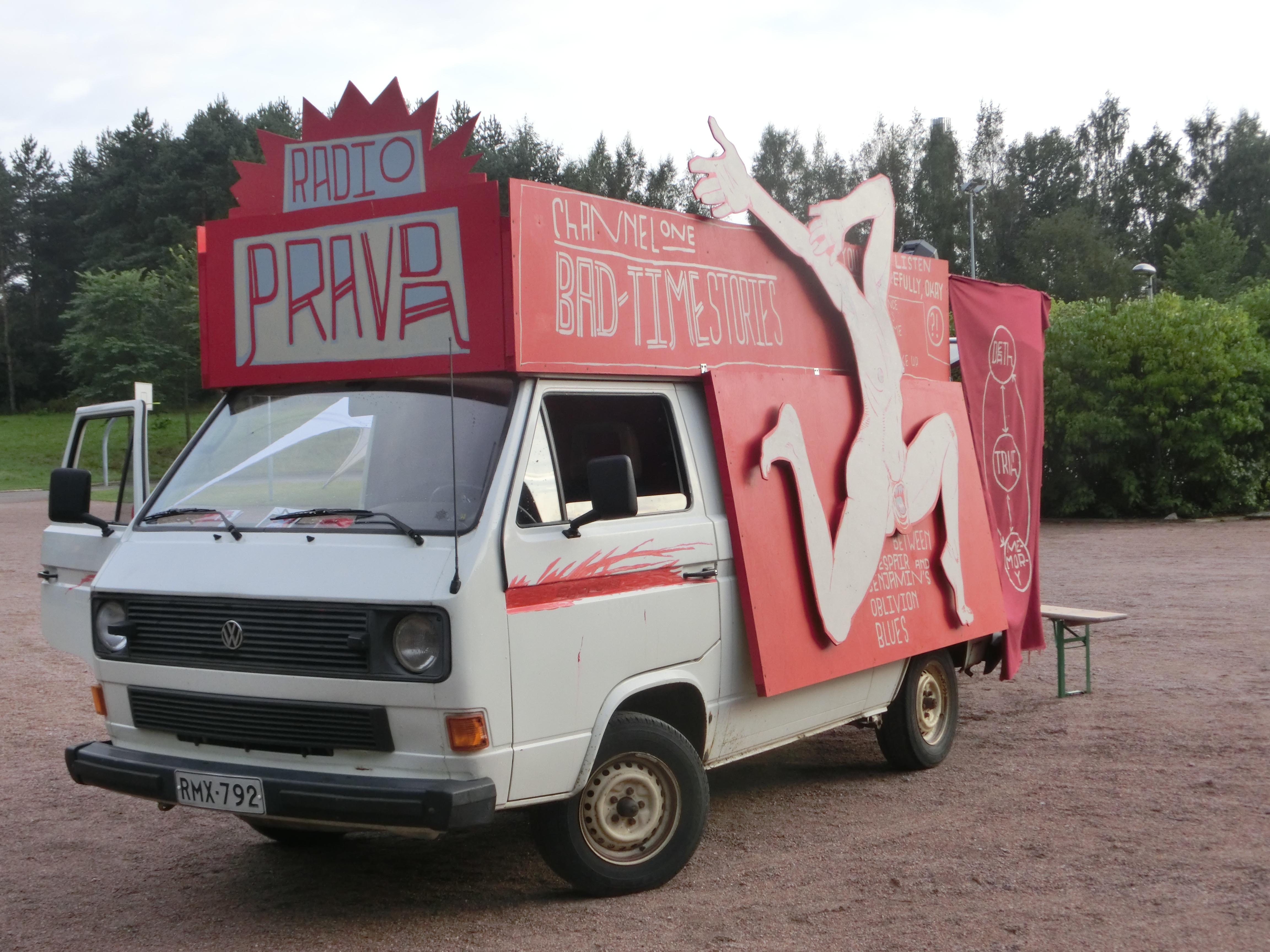 The first project of Cross-Boarder-Manifestations, RADIO PRAVDA, was produced for the TO THE SQUARE [2] Fesival in August 2014 in Helsinki. Radio Pravda was a Moving Monument and an alternative broadcasting unit at once, that also became a festival within a festival. Radio Pravda was inspiring to many artists, filmmakers, poets, activists and musicians, who contributed to the project with their own soundworks. Nikolay Oleynikov and friends on RADIO PRAVDA: Oxana Timofeeva, Jonathan Brooks Platt, Grey Violet, Lilu S. Deil, Ilya Yakovenko, Kirill Medvedev, Roman Osminkin, Ivor Stodolsky, Paleface, Olga Jitlina and Jon Irigoyen, Misha Griboyedow, Mokhnataya Podnoga (Shaggy Leg-up), Antti Rautiainen, Technopoesia, Kievskie Podmyshki (Kiev Armpits), Marina Maraeva, Arkadiy Kots Band, Artur Aristokisyan and many others. Some of the artists which have participated in RADIO PRAVDA are affiliated to the SCHOOL of ROSE (School for Engaged Art, Chto Delat). Some of their radio pieces are based on their participation in the School’s work.